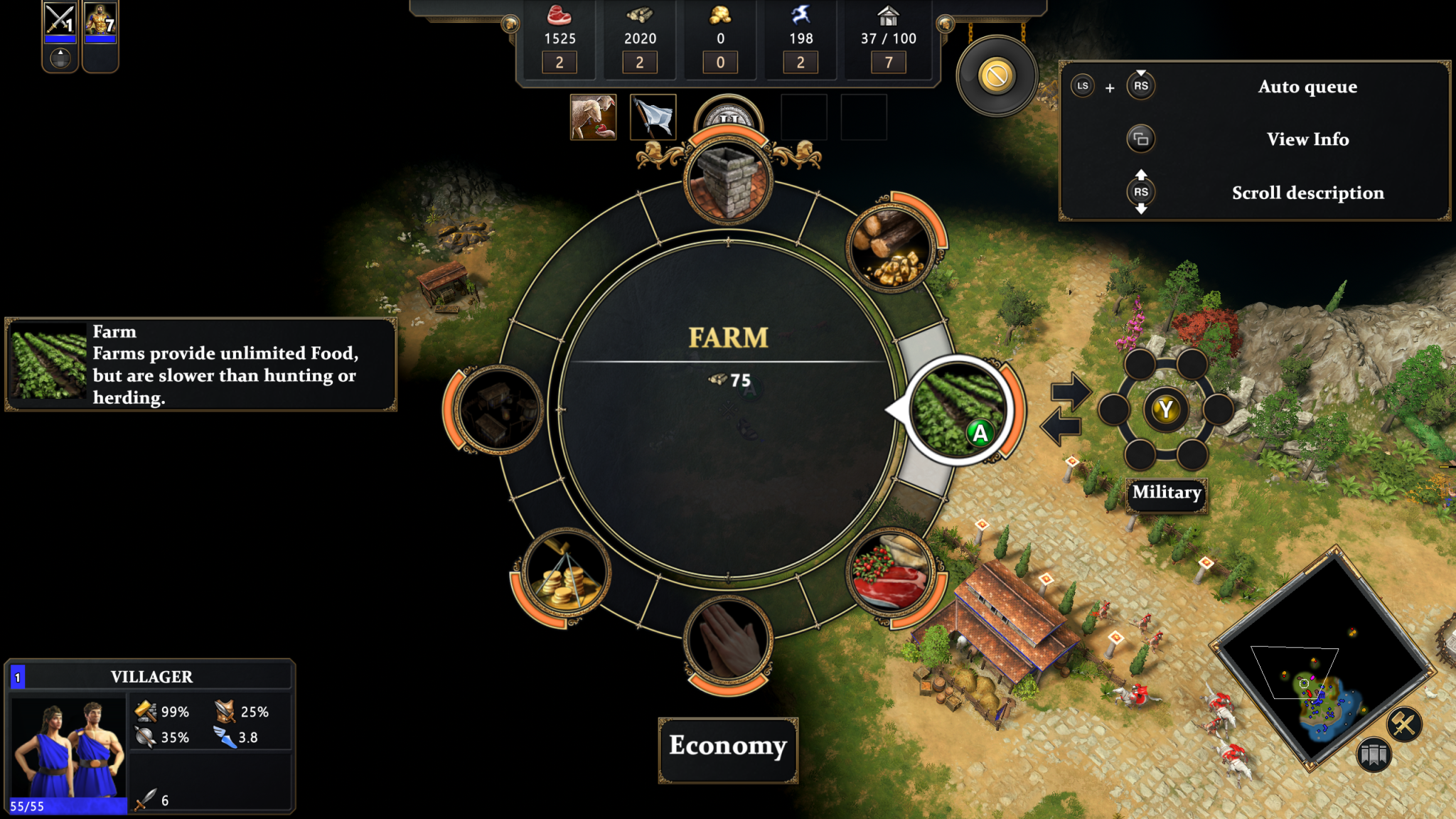 Because of this, I ended up using the controller shortcuts for unit selection much more liberally—a tap of a D-pad direction to select a single villager or hero, for instance, or holding down another direction to auto-select all military units. Combining the left trigger with the D-pad to instantly select specific types of military units also quickly became second nature and a simple way to manage multiple small groups at once.