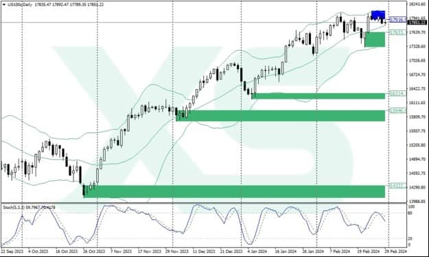The Nasdaq index (US100) is currently moving in a tight triangle pattern on the chart throughout the day, since reaching its peak at $18,100 on February 23rd, which was its historical high. This movement is supported by a delicate balance between buying and selling forces. A breakthrough below the key support level at $17,633.25 could intensify selling pressure, targeting the lower limit of the Bollinger Bands at $17,328.