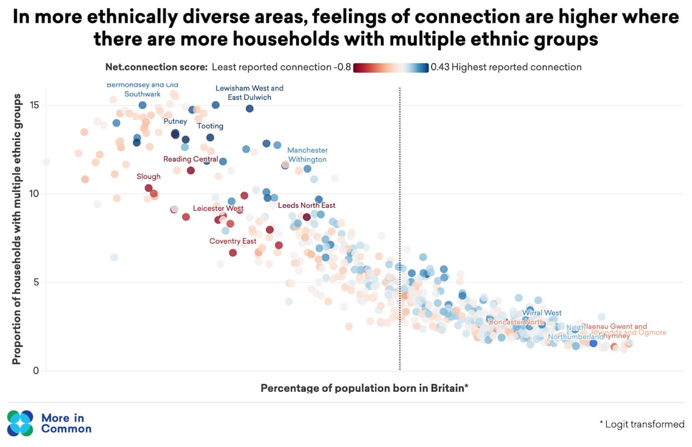 Areas with high rates of multi-ethnic households-  a good proxy for inter-ethnic mixing- tend to report stronger feelings of connectedness and were less likely to have experienced unrest in summer 2024. However, where different communities live parallel but separate lives, feelings of mistrust and alienation are more common.