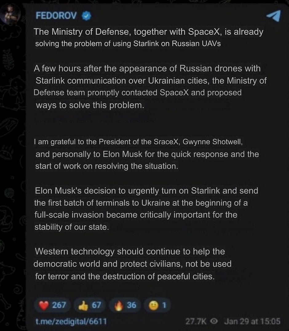 Fedorov publicly thanked SpaceX President Gwynne Shotwell and Elon Musk for their rapid response, emphasising that Starlink’s emergency activation and early delivery of terminals in 2022 had been “critically important for the resilience of our state.”