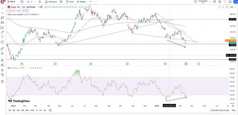 The only glimmer of hope is the hidden positive RSI divergence, with the price action making lower lows and the RSI forming higher lows, signifying weakening bearish momentum. Rahul expects sideways momentum for a while before Tesla releases the Q1 2024 earnings report in April 2024.